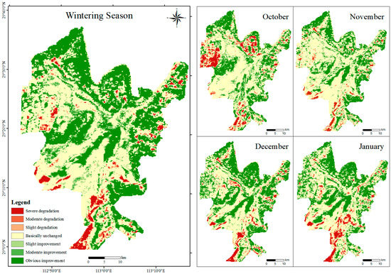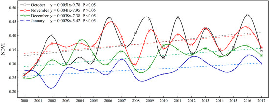 According to the statistics of monthly NDVI during wintering seasons, the multi-year mean NDVI in October, November, December, and January of the following year were 0.371, 0.373, 0.324, and 0.280, respectively (Figure 3). The maximum monthly average NDVI in the study area generally occurred in November, followed by October, December, and January. Among them, the trends of monthly mean NDVI in October and November were similar and fluctuated greatly. The trends were consistent to the interannual variations in NDVI with two apparent stages (Figure 2). The study also indicated a steady increase in the monthly mean NDVI in October and January during the past decades.