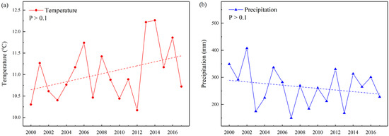 Climate factors are considered to be the important environmental factors that affect vegetation dynamics [45]. The temperature and precipitation data were derived from the National Meteorological Information Center, which undergoes strict quality control, extreme value tests, and time consistency tests. We obtained data from a total of 10 meteorological stations in and around the study area from October 2000 to January 2018. The long-term temperature and precipitation data were used to analyze its impact on vegetation changes. The daily temperature and cumulative precipitation were respectively averaged and accumulated on different time scales (monthly and seasonal). Then, the spatial analysis tool of ArcGIS was used to carry out spatial interpolation processing on these meteorological data using the inverse distance weighted interpolation method, with a spatial resolution of 250 m, so that the final interpolation results matched the MOD13Q1 data.