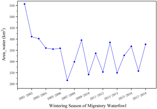 Over the past 18 years, the water area varied from 216 to 395 km2 during the wintering season at the East Dongting Lake wetland (Figure 8). It showed a significant decreasing trend from the wintering season of 2000 to 2003. This trend ended in 2004 but fell again in 2006. Since then, the water area has fluctuated with remarkable regularity. After the operation of the TGD in 2003, the sediments of the reservoir alleviated the shrinkage of East Dongting Lake. The water area of the East Dongting Lake decreased significantly in the wintering season of 2003, 2006, and 2009. During these years, the TGD experienced important water storage. The water area of the river-communicating lake in the middle and lower reaches of the Yangtze River, such as the East Dongting Lake, decreased significantly during the water storage period. In addition, the unprecedented drought events in 2011 and 2013 reduced the water area of East Dongting Lake.
