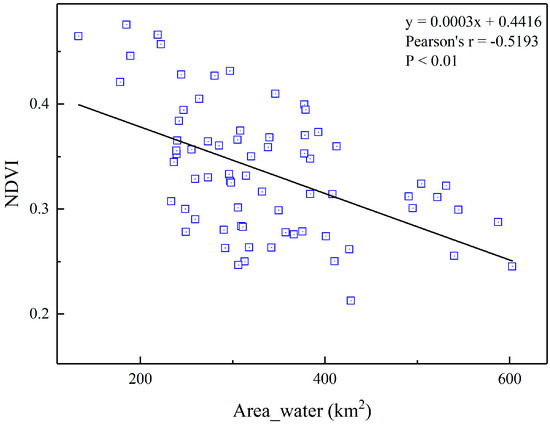 The effects of hydrologibal conditions on wetland vegetation are presented in Figure 9. The variability in NDVI at the East Dongting Lake wetland showed a significant negative correlation with the water area. The shrinking lake area, in turn, increased the area of exposed mudflat wetlands and grassland wetlands. In addition, vegetated areas, such as the Carex, expanded, with increasing vegetation coverage. Conversely, when the water area increased, the lake area expanded, leading to more areas close to the water body being submerged, which was adverse for the vegetation growth for wintering waterfowls.