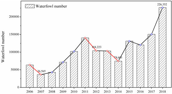 The populations of wintering waterfowls in January from 2006 to 2018 at the East Dongting Lake wetland.