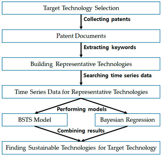 To build the technological structure of sustainable technologies, we combine the results of BSTS and Bayesian regression. Figure 1 shows the process of our proposed method.