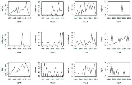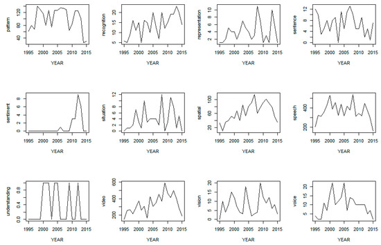 In this paper, we used the patent documents related to AI to illustrate how our model can be applied to real technology field. For our case study by the BSTS model and Bayesian regression, we used the R data language and its packages [21,22,24,25]. We retrieved the AI patents from the patent database WIPSON [19]. The collected patents were applied and registered from 1995 to 2016. Finally, we selected total 13,858 valid patents by 2015. Using the text mining techniques [22], we preprocessed the patent documents and extracted AI keywords from the documents. There were 36 extracted keywords, as follows: analysis, awareness, behavior, cognitive, collaborative, computing, conversation, corpus, data, dialogue, feedback, figure, image, inference, interface, language, learning, mind, morphological, natural, network, neuro, object, ontology, pattern, recognition, representation, sentence, sentiment, situation, spatial, speech, understanding, video, vision, and voice. We divided the 36 keywords into three groups (Group I, Group II, Group III) by alphabetical order. Figure 2 shows the keyword trends by year of Group I.