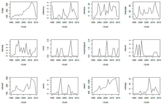 The keywords of image, inference, interface, language, network, and object show meaningful trends in the plots. In particular, keyword network shows a relatively more significant trend than other keywords. Finally, the trends of the keywords belonging to Group III over time is shown in Figure 4.