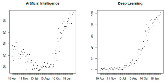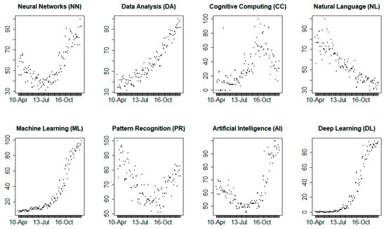 We knew that the patent keywords of pattern, recognition, spatial, speech, video, vision and voice represent significant trends for AI technology. Using the visualization results of collected AI patent data, we determined the technologies related to AI as follows; neural networks (NN), data analysis (DA), cognitive computing (CC), natural language (NL), machine learning (ML), pattern recognition (PR), artificial intelligence (AI), and deep learning (DL). We collected trend data for the AI technologies described above from January 2010 to June 2019 in Google Trends [23]. Using the collected data, we visualized the trend data of AI technology in Figure 5.