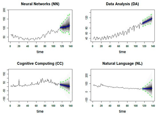 The NN (neural networks) has the largest value in the average of the 24-month forecasting. We know that deep learning, an important element of AI, is based on neural networks. The mean values of DA (data analysis) and ML (machine learning) are also larger than others. The mean value of CC (cognitive computing) is the smallest in the all technologies. This is because it is an AI technology used in some fields such as psychology or cognitive science. The following figures show the predicted values for eight detailed technologies and their confidence intervals of predicted values. Figure 6 shows the visualization of BSTS forecasting for NN, DA, CC, and NL.