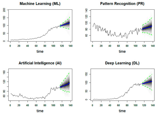 Both ML and PR, including AI and DL, are forecasted to be increased. The predictive interval of PR is larger than others. So, we expect the future trend of PR to be relatively large. From the results of Figure 6 and Figure 7, we found that technologies of NN, DA, ML, and PR are expected to be continuously developed in the future.