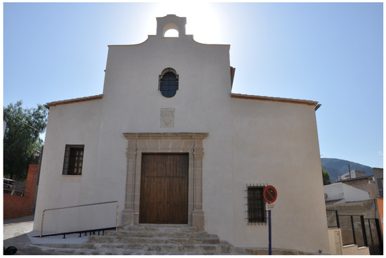 The Chapel of the Holy Sepulcher has a surface area of 150.00 m, and as shown in Figure 2, it is characterized by its construction using thick masonry load-bearing walls, and by its absence of holes in the façade. This typology is typical in southeastern Spain for buildings of religious use, and adapts perfectly to the prevailing climate in the area since thermal inertia and solar control, along with adequate ventilation are traditional solutions for conditioning buildings in warm climates.