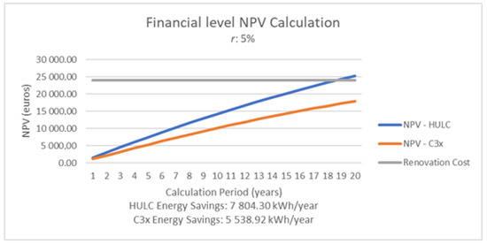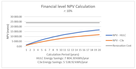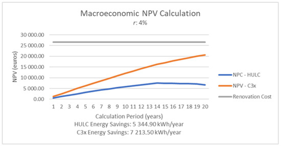 The technical decisions made for rehabilitation can lead to an increase in the construction costs and long-term savings in the maintenance or operation of a building. This variable allows a comparative analysis of the possible advantages of using higher-quality products, which are initially more expensive compared to a less significant investment in terms of subsequent costs. In public residential buildings, it has been determined that seeking lower energy savings and emissions reductions has the relevant advantage of being sustainable from a financial point of view, compared to an intervention that seeks maximum energy savings [34].