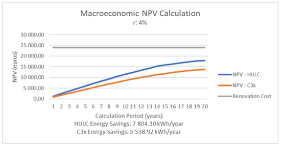 This research demonstrates the validity of the NPV calculation as a measure to evaluate the economic viability of an intervention, but these data must be supported by robust results from the evaluation of the building energy performance. In addition, the savings obtained should come from other types of construction improvements that are not penalized for their CO emissions.