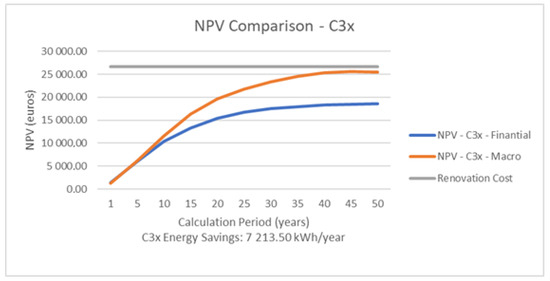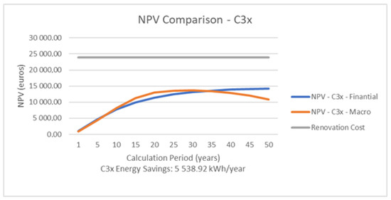 Comparison between financial and macroeconomic NPV with energysavings data obtained from CE3X during 50 years for the Chapel.