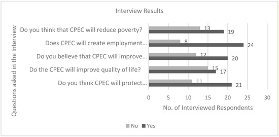 We also conducted a face-to-face interview with 48 respondents being selected randomly from the selected areas. However, as mentioned in the research design, there were 16 respondents who did not meet the criteria i.e., less educated and were unaware of the CPEC. Hence, we excluded the response of the less educated people to reduce the spuriousness of the results. The results of 32 (28 male and only four female) respondents are presented in Figure 2.