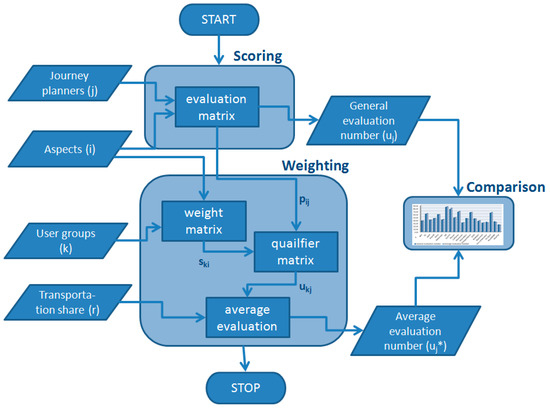 The evaluation was performed in two main steps (Figure 1). First, the journey planners were compared (scoring) to each other based on the elaborated framework of aspects, which resulted in the general evaluation number. Then user groups, their characteristics, and their transportation share were defined. Taking preferences of the user groups into account (weighting), the average evaluation number for each journey planners was calculated. Finally, based on this new measure, the multimodal journey planners can be compared to each other. The elaborated method is based on the author’s previous works with his supervisor during the PhD studies [26].