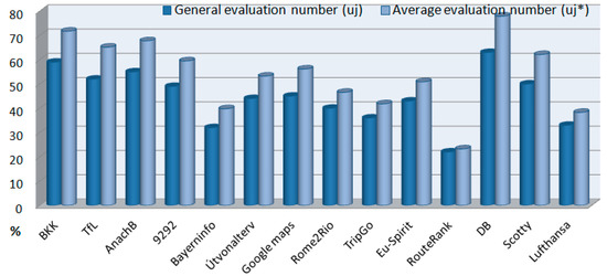 The evaluation numbers are presented and summarized in Table 4. The rows represent the aspects (i) and the columns represent the journey planners (j). The general evaluation numbers of the journey planners (uj) are calculated by the summation of the evaluation matrix elements (pij) by columns. Not only the evaluation numbers, but the values in percentage are also shown. The maximal obtainable value was 100, where 10 points for each single aspect was the maximum. Values were assigned to the journey planners based on how much the journey planner met the requirements of the aspects.