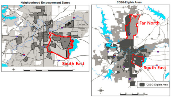 Table 7 displays the number of vacancy-related policies by variables in their order of influence from high to low. It indicates that the comprehensive plan of the city provides 123 vacancy related policies/strategies, and among them, 63 (or 51%) policies were created for South East where is one of the most vulnerable districts in Fort Worth, and 41 of 63 policies were associated with economic growth or quality of life such as reducing the unemployment rate, poverty, and increasing income. Especially, in order to improve the local environment and revitalize the economy of socially and economically vulnerable districts, Fort Worth adopted diverse housing policies and development incentives programs to increase the supply of quality housing and expand homeownership opportunities. For example, through Neighborhood Empowerment Zones (NEZs) program and Community Development Block Grant (CDBG) funds, local development activities were planned for low to moderate income households such as affordable housing and infrastructure development within South East district (See Figure 2).