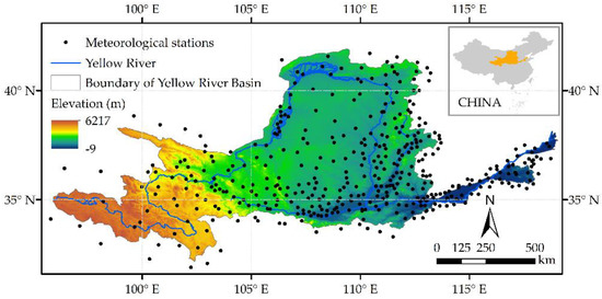 The Yellow River, which is the second longest river in China, has a total length of 5464 km and flows through nine provinces. The study area in central China (32°9′–41°51′ N, 95°53′–119°14′ E) encompasses a watershed area of 752,000 km2 (Figure 1). The elevation of the study area terrain is high in the west (6199 m) and low in the east (−9 m), and the average slope is about 2.4‰. There are considerable geomorphological differences between different districts. The basin has a temperate monsoon climate with abundant sunshine. Seasonally, it is wet and rainy in summer, and cold and dry in winter. The spatial distribution of precipitation in the area decreases from the southeast toward the west, and the average annual precipitation is 466 mm. The average annual temperature is between −4 °C and 14 °C [32]. Currently, the China Meteorological Data Network (http://data.cma.cn) constitutes approximately 405 meteorological stations that are used to form the CGDPA product in and near the boundary of the YRB. The spatial distribution of these stations is very dense but irregular, as shown in Figure 1, and the data acquired are also of importance temporally.