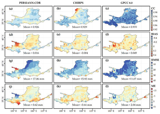 The spatial distribution of CC, BIAS, RMSE (mm/month), ME (mm/month) of PERSIANN-CDR, CHIRPS, GPCC 8.0 versus CGDPA over the YRB.