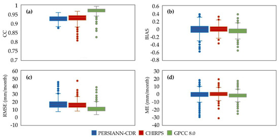 Boxplot of the statistical indicators of PERSIANN-CDR, CHIRPS, GPCC 8.0 versus CGDPA: (a) correlation coefficient (CC); (b) relative bias (BIAS); (c) root mean-squared error (RMSE); (d) mean error (ME).