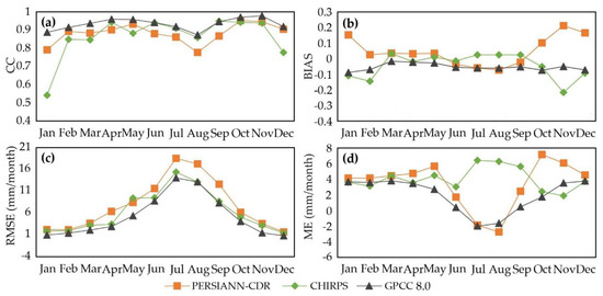The statistical indicators of PERSIANN-CDR, CHIRPS, GPCC 8.0 versus CGDPA at the monthly scale: (a) correlation coefficient (CC); (b) relative bias (BIAS); (c) root mean-squared error (RMSE); (d) mean error (ME).