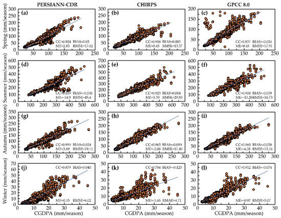 The CC, BIAS, RMSE (mm/season), and ME (mm/season) of PERSIANN-CDR, CHIRPS, GPCC 8.0 versus CGDPA at the seasonal scale.
