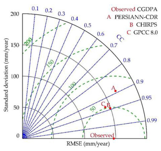 Taylor diagram showing statistical comparison of the CGDPA with the estimates of annual mean precipitation during 1983–2016 of the PERSIANN-CDR, CHIRPS and GPCC 8.0.