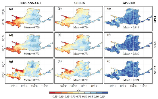 The spatial distribution of the CC value of SPI-1, SPI-3, and SPI-12 based on PERSIANN-CDR, CHIRPS, GPCC 8.0 versus CGDPA over the YRB.