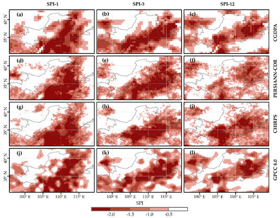 The PERSIANN-CDR, CHIRPS and GPCC 8.0 products have high spatial resolution and relatively satisfactory correlation (CC > 0.8) in comparison with the CGDPA product in terms of the estimation of precipitation on multiple timescales (Section 3.1) over the YRB. Given the reasonable performance of these precipitation products, this section evaluates their applicability to drought monitoring based on the SPI. The SPI-1, SPI-3, and SPI-12 were calculated for the PERSIANN-CDR, CHIRPS, GPCC 8.0 versus CGDPA products over the 34-year period.