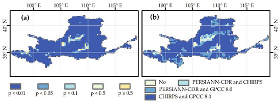 Statistical indicators are commonly used to evaluate the accuracy of satellite and reanalysis precipitation products. However, there are data differences among the evaluated products, and it is worth discussing and studying whether the differences among PERSIANN-CDR, CHIRPS, and GPCC 8.0 are statistically significant or not. Figure 11 shows that the p value is obtained by Friedman test and any two products of them are significantly different by the multcompare function under the condition of the corresponding significance test. From Figure 11a, it can be seen that the data difference of the three products passes the 0.01 significance test in most areas of the YRB, and 0.05, 0.1 and 0.5 significance test in a small part of the region, but does not pass the 0.5 significance test in the central part of the YRB. The data difference of CHIRPS and GPCC 8.0 is very significant, covering most area of the YRB, while the data difference of PERSIANN-CDR and GPCC 8.0 is significant in a smaller area, and the area with significant difference between the two satellite products is the smallest, as shown in Figure 11b. This may be because the datasets of the satellite are monitored by remote sensing, while GPCC 8.0 obtains data through meteorological stations. In a word, the data difference between satellite and reanalysis precipitation products is significant, but the data difference between satellite products is not significant. This is consistent with the difference in the accuracy of these products monitoring precipitation and drought (Figure 3, Figure 4 and Figure 8).