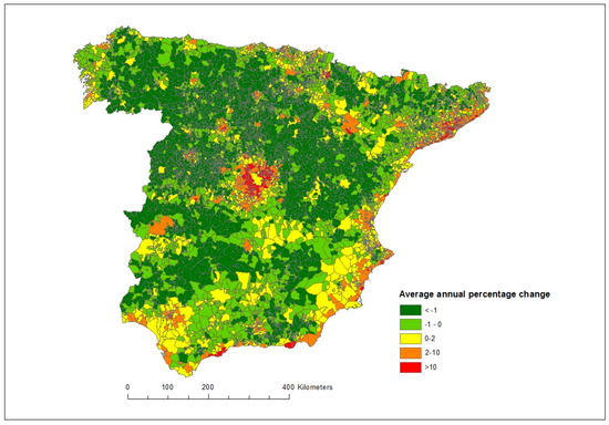 Population concentrates increasingly in urban areas along the coast, the two main river valleys of the Guadalquivir and the Ebro and in the center around the capital Madrid, while vast parts of the country—mainly the rural interior parts—experienced population loss during this period. Although this process of population concentration had started already at the beginning of the 20th century [29], it was in the 1960s that internal migration intensified very strongly with the transition from an agricultural to an industrial economy. Migratory movements reached an unprecedented scale that profoundly changed the spatial population distribution [30,31]. Similar patterns of population concentration have also been reported for other countries, e.g., France [32].