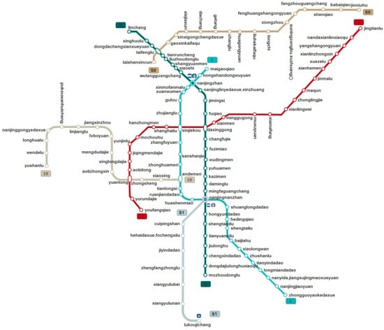 Figure 1 shows the route map of Nanjing metro in 2017. As of 17 January 2017, Nanjing metro has opened six lines in the order of 1, 2, 10, S1, S8, and 3. Figure 1 shows different lines in different colors. The name of stations of the metro lines are indicated in the figure. From the subway map, we can see that the main lines are line 1, line 2, and line 3, which run through the main urban area of Nanjing. Line 10, line S1, and line S8 are extension lines connecting remote suburbs of Nanjing. Xinjiekou Station, the intersection of line 1 and line 2, is the geographical and commercial center of Nanjing. Line 1 and line 3 form a circular structure, which depicts the outline of the main urban area of Nanjing. The two intersections are Nanjingzhan of the old railway station and Nanjingnanzhan of the new railway station. They are also important transportation hubs.