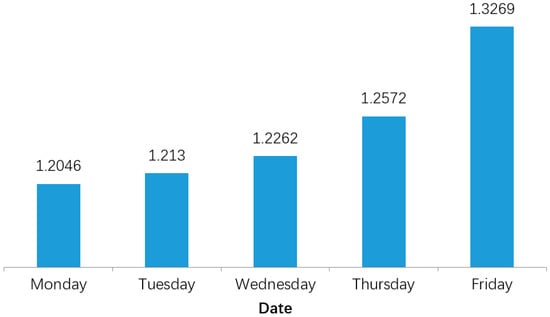 In this study, the smart card swiping records during five working days with normal weather were selected for statistical analysis of passenger flow. The daily card swiping data were counted to 24 h, from 0:00 to 23:00. Passenger flow from Monday to Friday increased from 1.20 million to 1.32 million. The five-day inbound curve is basically coincidental with the five-day outbound curve. The inbound and outbound curves also have a certain reflection relationship.