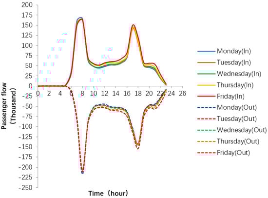 Figure 3 shows the 24-h passenger flow fluctuation of the metro in five working days. The time is from 0:00 to 23:00. The positive number of passenger flow indicates the number of inbound passengers and the negative number indicates the number of outbound passengers. The five-day inbound curve is basically the same as the five-day outbound curve, because the daily passenger flow gap is not large. If the passenger flow disperses to 24 h, the gap will become smaller. The difference is that the morning peak of the station is a blunt angle, with two peaks of 7:00 and 8:00, while the morning peak of the station is a sharp angle, with an 8:00 peak. Inbound and outbound evening peaks are sharp corners, with a peak of 18:00. Before 6:00 in the morning, almost no one took the subway. By 18:00 p.m., it was a small peak, and then the number of passengers began to decrease. By 23:00 p.m., almost no one took the subway.