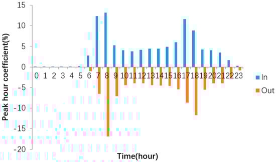 Figure 4 shows the peak hour coefficient of daily average passenger flow. Figure 4 corresponds to Figure 3 to some extent, but the peak hour coefficient can be expressed by histogram and proportion, which can visually show the crowding degree of passenger flow at time points. During the morning peak period, the number of arrivals concentrated at 7:00 and 8:00, accounting for 12% and 13% respectively, while the number of departures concentrated at 8:00, accounting for about 17%. These data reflect that some subway passengers in Nanjing use the subway as a commuting tool, starting work at 9:00 in the morning. Considering the distance of different routes, many passengers choose to leave at 7:00 or 8:00.
