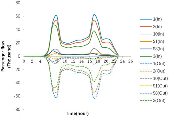 Figure 5 shows the 24-h distribution of the daily average passenger flow of six metro lines. Here, the traffic of all stations on each subway line is counted on each line. As can be seen from the figure, the order of passenger flow is line 1, 2, 3, 10, S8, and S1. The passenger flow of trunk line 1, 2, and 3 is much larger than that of branch line 10, S1, and S8.