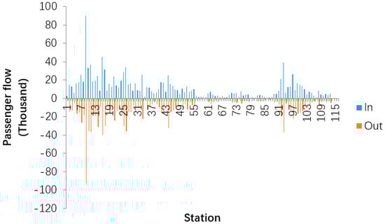 Figure 7 shows a comparison of the average daily passenger flow at 113 metro stations. From the figure, we can see that there is a certain mapping relationship between inbound and outbound passenger flow, and the basic figure is consistent. The station with the largest passenger flow is very obvious, reaching about 90,000, which is Xinjiekou. Xinjiekou is the intersection of metro line 1 and line 2. It is also the geographical and commercial center of Nanjing. Although the city scale of Nanjing is expanding and the new commercial center is also dispersing passenger flow, Xinjiekou still occupies an important commercial position after transformation and upgrading. In addition to Xinjiekou, some stations with large passenger traffic remain around 30,000–40,000. There are also many stations with passenger flow of less than 3000, which indicates that these stations are in relatively remote areas, so passenger flow is very small, and further commercial development is needed to drive passenger flow.