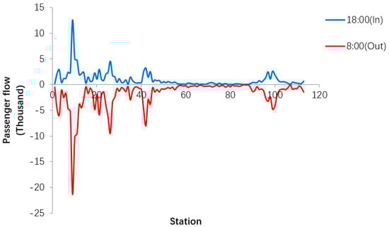 Figure 8 shows the comparison of metro stations of inbound passenger flow at 8:00 and outbound passenger flow at 18:00. The figure shapes of 8:00 inbound passenger flow and 18:00 outbound passenger flow are very similar at metro stations, only individual stations are different. Inbound passenger flow at some stations is slightly larger than outbound passenger flow. The three stations with the highest passenger flow at 8:00 are Maigaoqiao, Youfangqiao, and Liuzhoudonglu, which are about 10,000. Other inbound passenger flows are basically below 5000. The four stations with the highest outbound passenger flow at 18:00 are Liuzhoudonglu, Xinjiekou, Maigaoqiao, and Youfangqiao, which are about 7000–8500. The outbound passenger flow of other stations is basically below 5000. Among the symmetry comparison of inbound and outbound graphics, the most unusual one is Xinjiekou, where the inbound passenger flow at 8:00 is less than other stations, while the outbound passenger flow at 18:00 is more than other stations. The reason may be that Xinjiekou, as a commercial center, is gradually decreasing in population, so fewer people go out to work and more people leave work at 18:00.