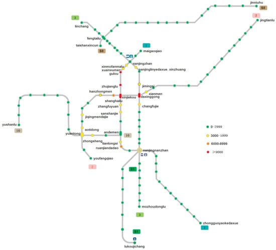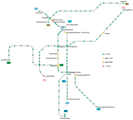 Nanjing metro network is evolving, and passenger flow has also changed accordingly. Based on the smart card data of the Nanjing metro system in China, Fu X et al. studied the changes of passenger flow and travel time after the new metro line 4 opened in 2017 []. Li J et al. established a passenger flow fluctuation model to evaluate the impact of weather conditions on the fluctuation of single-line passenger flow of Nanjing metro in China []. Wei Y et al. established the supernetwork model of Nanjing metro network, proposed new parameters to describe the model, and compared it with the traditional space L and space P models []. Yu W et al. used the complex network method to analyze the space–time evolution of Nanjing metro network according to the opening sequence of 10 metro lines in Nanjing []. Zhao J et al. used the multiple regression model and multiplication model, respectively. Taking Nanjing metro system as an example, the paper discussed the influencing factors of passenger flow between stations and stations [].