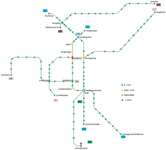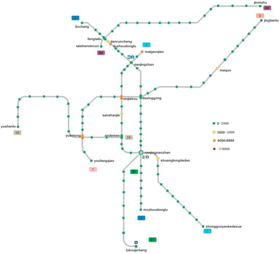 According to the international general color warning standards, there are four kinds of color. Green represents unimpeded, 0–2999, yellow represents congestion, 3000–5999, orange represents congestion, 6000–8999, red represents very congested, more than 9000. In order to express the warning color conveniently, the color of the subway line waschanged to grey. The circle represents different subway stations, and the color in the circle represents the passenger flow of the subway stations. On the thermodynamic chart, the name of the starting station, the intersection station, and the station divided by the congestion state of the metro line are labeled.
