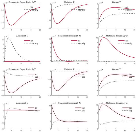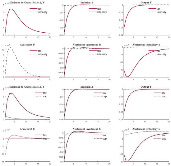 Figure 1 plots the IRFs of our targeted variables to one standard deviation of TFP volatility shocks. The solid lines are the IRFs under a constant carbon tax rate, while the dashed lines in the upper and lower panels are, respectively, the IRFs under carbon intensity and capacity regimes. For the carbon tax regime, the primary effect of a positive TFP uncertainty shock is to reduce the firms’ expected value of future output. The lower expected future output discourages firms’ abatement investment; thus, falls initially. With the constant abatement effort fixed by the constant carbon tax rate, the carbon intensity is entirely determined by the abatement technology . The lower abatement investment is accompanied by a lower level of abatement technology, and therefore the IRF of carbon intensity is above zero over time. Likewise, capital investment also decreases, so lower capital is accumulated. As a result, both the output and CO emissions decrease.