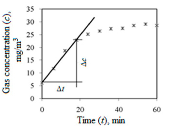 where δC/δt is the angular coefficient of the regression line of the linear branch of the gas saturation function, while Vch and Ach are the volumes and the area of the chamber.