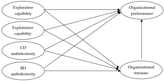 Third, based on the results of previous works, this study divides dynamic capabilities into exploitation and exploration capabilities, and ambidexterity into the combined dimension of ambidexterity (CD) and the balanced dimension of ambidexterity (BD) [,], so as to redefine the relationships among dynamic capabilities, ambidexterity and organizational performance from the perspective of tension, thereby enhancing the application of dynamic theory.
