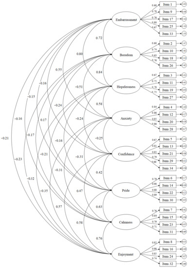 The eight-factor structure of the model was examined in relation to the various fit indices and yielded corresponding values of: χ2 (712, N = 864) = 2446.07, p = 0.001; χ2/df = 3.43; CFI = 0.85; TLI = 0.83; IFI = 0.85; and RMSEA = 0.074 (IC 90% = 0.071–0.077); SRMR = 0.086. An examination of these fit indices and the residual standardized covariances indicated the possibility of areas for improvement given that residual values of some items correlated with residual values of other items with standardized residual values exceeding 2.00 [46]. Four items were subsequently eliminated from each of the factors of boredom, hopelessness, calmness, and anxiety. Following the elimination of these four items, there was an improvement to the indices of fit: χ2 (566, N = 864) = 1352.35, p = 0.001; χ2/df = 2.39; CFI = 0.92; TLI = 0.91; IFI = 0.92; RMSEA = 0.056 (IC 90% = 0.052–0.060); and SRMR= 0.067. In the revised model, the standardized residual values of each of the items were below 2.0, and the standardized factor loadings were statistically significant (p < 0.001) and ranged from 0.33 to 0.90. Subsequently, individual items with loadings below 0.50 were eliminated from two factors (Pride and Enjoyment). Excluding these two items resulted in an improvement to the fit indices in the model: χ2 (499, N = 864) = 1018.30, p = 0.001; χ2/df = 2.04; CFI = 0.94; IFI = 0.94; TLI= 0.94; RMSEA = 0.048 (IC 90% = 0.044–0.053); and SRMR = 0.048. This model was finalized as such (Figure 1) as each of the standardized residual values were consequently below 2.0, and standardized factor loadings were statistically significant (p < 0.001) and ranged between 0.57 and 0.90.