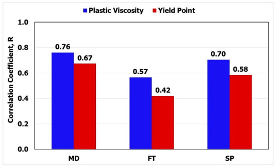 Table 1 lists the statistical parameters of the nine-hundred data points. The drill-in fluid covered a wide range of fluid density where the MD ranged from 64 to 121 ppg. The FT ranged from 35 to 91 s/quart, and SP ranged from 0 to 32.5%. PV ranged from 7 to 51 cP, and the YP ranged from 19 to 45 lb/100 ft2. Figure 1 shows that the PV was a strong function of MD and SP, where the R was 0.76 and 0.70 for MD and SP, respectively. PV was a moderate function of FT, with its R being 0.57. YP was a strong function of MD and moderate function of SP and FT. The R was 0.67, 0.58, and 0.42 for MD, SP, and FT, respectively, as seen in Figure 1.