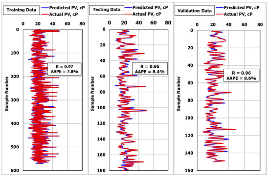 Figure 2 shows that the R was 0.97 and the AAPE was 7.8% between the actual and predicted PV for the training data. For testing the model, 180 data points were used. Figure 2 shows that the R was 0.95 and the AAPE was 8.4% between the actual and predicted PV for the testing data.
