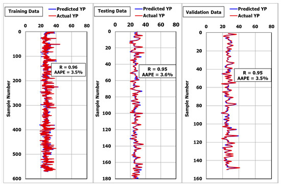 Figure 3 shows that the R was 0.96 and the AAPE was 3.5% when using the MSaDE-ANN model to predict the YP values for the training data set. To test the developed model for YP, another set of data (180 unseen data points) was used. Figure 3 shows that for the unseen data, the R was 0.95 and the AAPE was 3.6. These results confirmed the high accuracy of the MSaDE-ANN model for predicting the YP from the MD, FT, and SP.