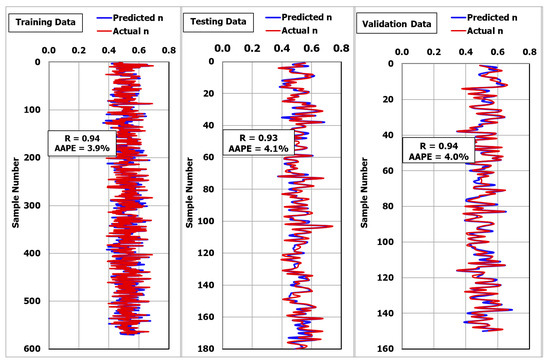 Figure 4 shows that the MSaDE-ANN predicted n with high accuracy, where the R was 0.94 and the AAPE was 3.96% for the training dataset (570 data points). The same results were obtained when applying the ANN-n model for the unseen data set (180 data points). The R was 0.93 and the AAPE was 4.1% between the actual and predicted values of n, as seen in Figure 4.