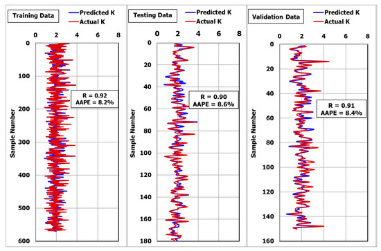 Figure 5 shows that the R was 0.92 and the AAPE was 8.0% when plotting the actual and predicted values of K for the training dataset. For testing the developed ANN-K model, 150 unseen data points were used. Figure 5 shows that the R was 0.90 and the AAPE was 8.6% for the testing data.