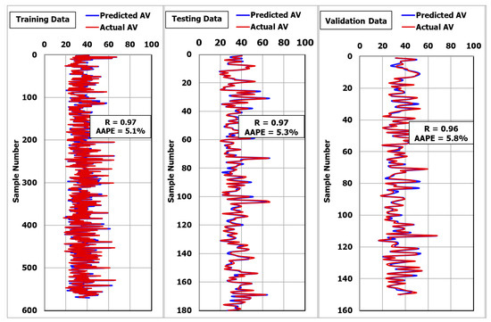 Figure 6 shows the high accuracy of the developed ANN-AV model for the training dataset using the MSaDE technique. The R was 0.97 and the AAPE was 5.1% when plotting the predicted and actual AV values (570 data points). The same results were obtained for the testing data set, where the R was 0.97 and the AAPE was 5.3%, as can be seen in Figure 6.