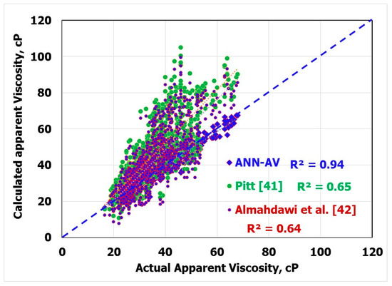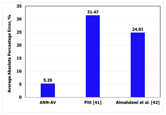 Applying Equations (16) and (17) using the available data sets (900 data points) showed that the ANN-AV model outperformed these models. Figure 7 shows that the coefficient of determination (R2) when plotting the calculated and actual valued of AV was 0.94 when the ANN-AV equation was used, 0.65 when Pitt’s equation was used, and 0.64 when Almahdawi’s equation was used. Figure 8 shows that the ANN-AV equation yielded the lowest AAPE (5.26%) as compared with the Pitt [41] equation (the AAPE was 31.47%) and the Almahdawi et al. [42] equation, where the AAPE was 24.81%.