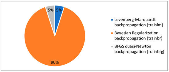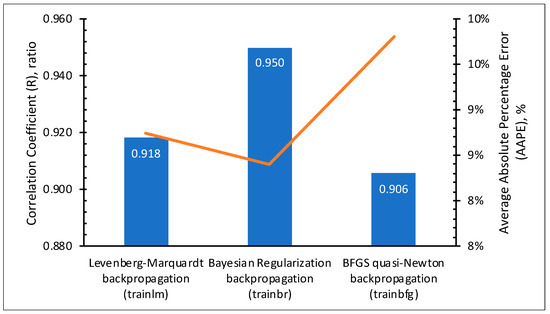 As mentioned earlier, the methodology of this study involved 20 independent optimization runs. Figure 9 shows that 18 out of the 20 optimization runs showed that the best training algorithm that achieved the best fit was the trainbr. The remaining two optimization runs were distributed equally between trainlm and trainbfg. This shows the consistency of this training function in achieving 90% of the best-fit performance compared to the other training algorithms. Figure 10 shows the best results achieved by each of the three training algorithms. The figure demonstrates that trainbr achieved the highest R and the lowest AAPE. The outperformance of trainbr could be related to its backpropagation capability of minimizing a combination of the squared errors and weights to determine the optimum combination that produces an ANN that is able to generalize well by preventing the overfitting (preventing increasing values of weights).